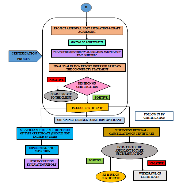 • Administrative approval of Director General(DG) shall be sought by Head for grant of certificate. A note for approval shall be sent to DG, along with the certificate, the conformity statements and the final evaluation report. Upon approval from DG the project completion report shall be sent to Finance & Administration (F&A) unit. F&A unit shall send an invoice to the client as per the contract. Certification Division shall issue the certificate upon receiving intimation from F&A regarding the receipt of the payment.