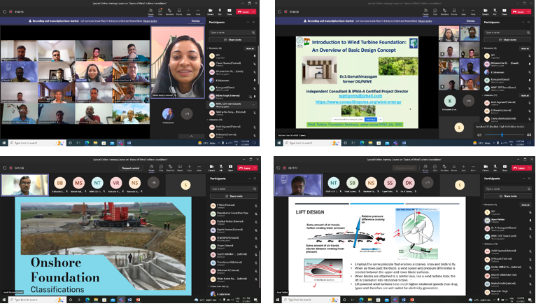 The Skill Development & Training, Infrastructure Management (SDT & IM) Division of NIWE has successfully conducted the Online Customized Training Course on "Basics of Wind Turbine Foundation" during 7th – 8th July 2022. The course addressed the basic aspects of Wind Turbine Foundation as per the Programme Schedule. The course was attended by 19 participants. During the 2 days of course, 6 lectures were scheduled. Scientists, wind turbine manufacturers and academicians from premier institutions, who have many years of experience in the field, handled the course content of the training.