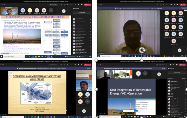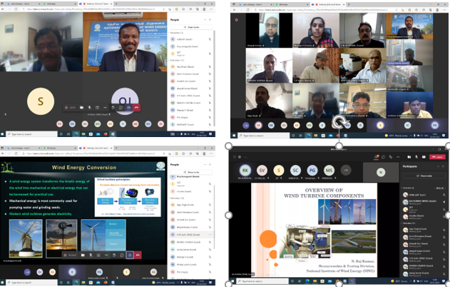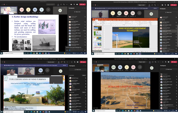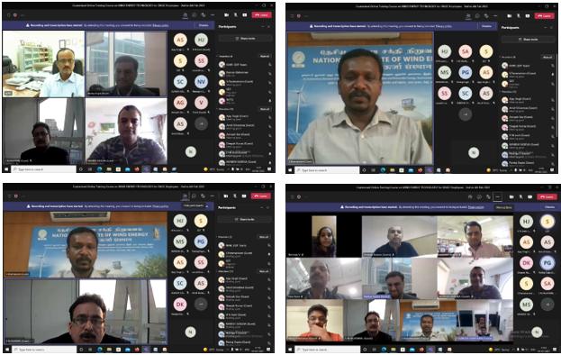 The Skill Development & Training, Infrastructure Management (SDT & IM) Division of NIWE has successfully conducted the Online Customized Training Course on "Wind Energy Technology" during 2nd – 4th February 2022. The course addressed all aspects of Wind Power starting from introduction to wind and its technology, wind resource assessment, installation and commissioning, Grid integration, operation and maintenance of wind farms, financial and policy aspects along with testing and certification of wind turbines. The course was attended by 16 participants. During the 3 days of course, 12 lectures were scheduled. The course content of the training were handled by Scientists, Engineers of NIWE, wind turbine manufacturers and academicians from premier institutions, who have many years of experience in the field.