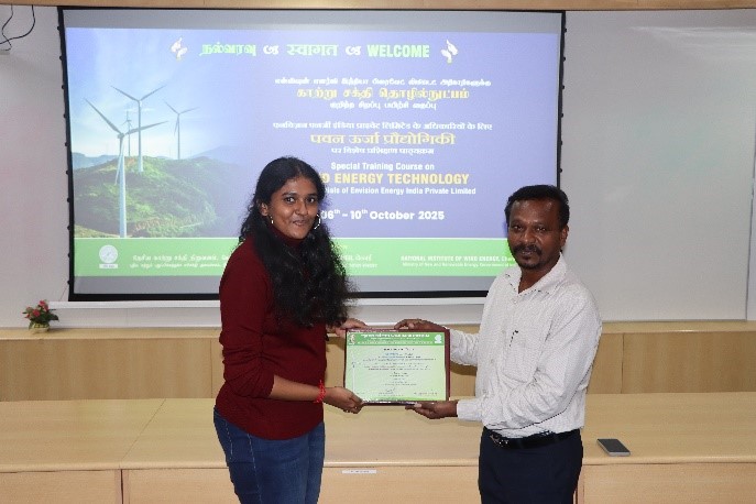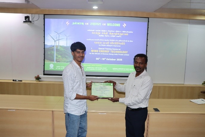 The Skill Development and Training Division of NIWE had successfully conducted the special training course on "WIND ENERGY TECHNOLOGY" for the officials of Envision Energy India Private Limited held during 06 to 10 October 2025. The course provided a focused study on all aspects of wind power, ranging from the basics of wind and resource assessment to project implementation and operations and maintenance. It also included offshore wind to cover the development of economically viable wind farm projects.  A total of 11 numbers of Envision officials have participated in the course.