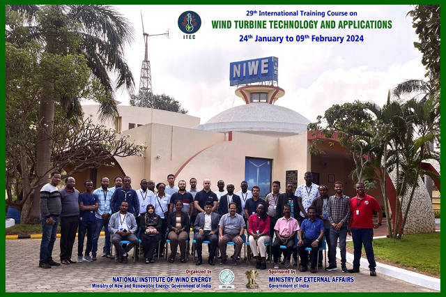 The SDT Division has successfully conducted the 29th International Training Course on "Wind Turbine Technology and Applications" during 24th January to 09th February 2024, sponsored by Ministry of External Affairs (MEA), Government of India under ITEC programme. The course addressed all aspects of Wind Power starting from introduction to wind and its technology, wind resource assessment, installation and commissioning, operation and maintenance aspects of wind farms in a focused manner along with financial and policy aspects. 28 participants attended the course from 11 ITEC partner countries, Eritrea, Ethiopia, Ghana, Kenya, Lebanon, Malawi, Maldives, South Sudan, Sri Lanka, Tunisia and Zimbabwe.