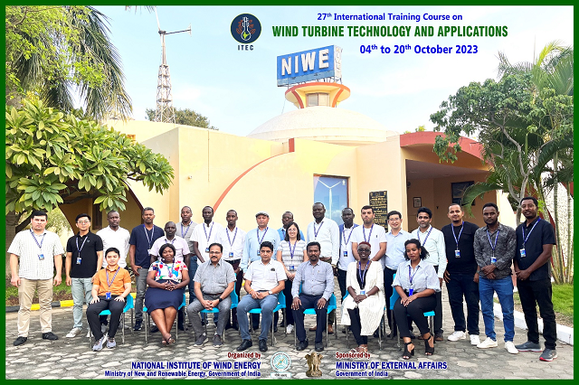 The SDT Division has successfully conducted the 27th International Training Course on "Wind Turbine Technology and Applications" during 04th to 20th October 2023, sponsored by Ministry of External Affairs (MEA), Government of India under ITEC programme. The course addressed all aspects of Wind Power starting from introduction to wind and its technology, wind resource assessment, installation and commissioning, operation and maintenance aspects of wind farms in a focused manner along with financial and policy aspects. 23 participants attended the course from 13 ITEC countries, Cambodia, Eritrea, Ethiopia, Ghana, Kenya, Morocco, Mozambique, South Sudan, Sri Lanka, Tajikistan, Uganda, Uzbekistan and Vietnam.