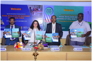 The SDT Division of NIWE had successfully conducted the International Training Course on "Design, Installation and Maintenance of Small Wind Turbine" specially for African Countries held during 15th November to 13th December 2018, sponsored by East and Southern Africa Division of Ministry of External Affairs, Government of India under India Africa Forum Summit – III (IAFS-III) programme. The objective of the International Course was designed in such a way that the participants themselves would design the parts / components of the Small Wind Turbines (SWT) from the low cost and locally available materials and construct, Install, commission and erect the turbine to produce power also to know Operation Maintenance practices. The course was attended by 21 participants from 10 African countries (Benin, Botswana, Cameroon, Chad, Ghana, Ivory Coast, Liberia, Nigeria, Tanzania and Uganda).