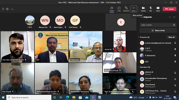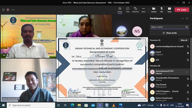 The Skill Development & Training and Infrastructure Management (SDT & IM) Division of NIWE has successfully conducted the 3rd International Online Training Course on "Wind and Solar Resource Assessment" conducted between 10th to 21st October 2022, sponsored by Ministry of External Affairs (MEA), Government of India under e-ITEC programme. The Course addressed all aspects of Wind and Solar resource assessment in a focused manner along with a brief introduction to wind and solar technology.