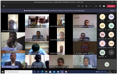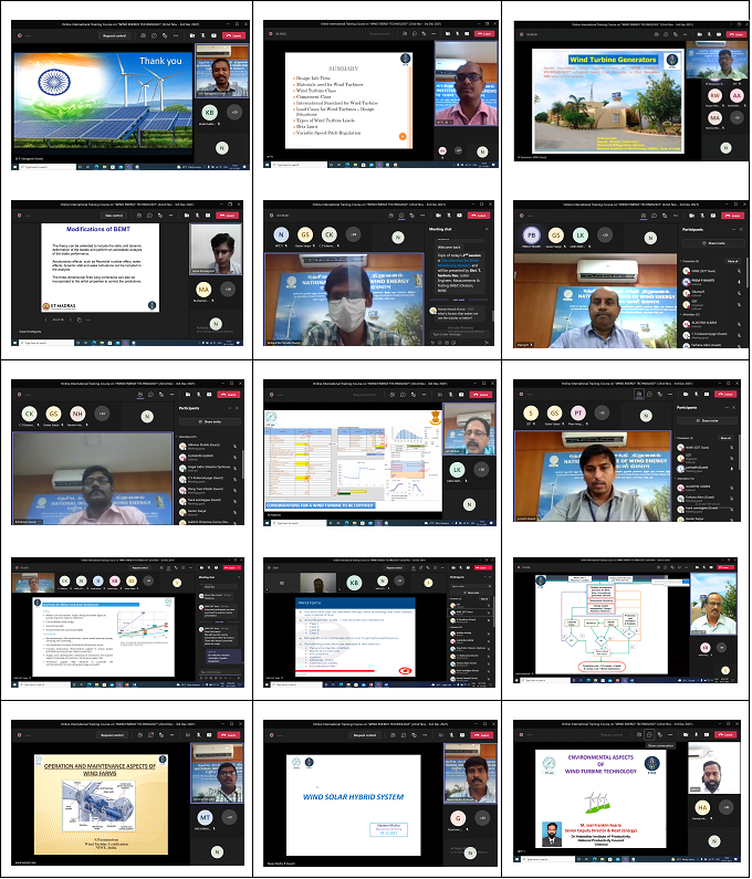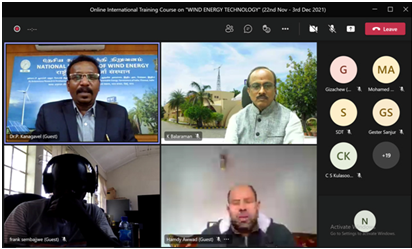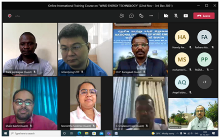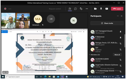 The Skill Development & Training, Infrastructure Management (SDT & IM) Division of NIWE has successfully conducted the Online International Training Course on "Wind Energy Technology" during 22nd November - 03rd December 2021, sponsored by Ministry of External Affairs (MEA), Government of India under e-ITEC programme. The course addressed all aspects of Wind Power starting from introduction to wind and its technology, wind resource assessment, installation and commissioning, Grid integration, operation and maintenance of wind farms, financial and policy aspects along with testing and certification of wind turbines. The course was attended by 36 participants from 18 ITEC countries, Azerbaijan, Bangladesh, Bhutan, Egypt, Ethiopia, Ecuador, Guatemala, Kenya, Lebanon, Malaysia, Mauritius, Namibia, Panama, Sri Lanka, Sudan, Thailand, Uganda and Vietnam.